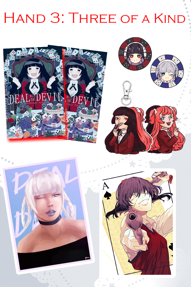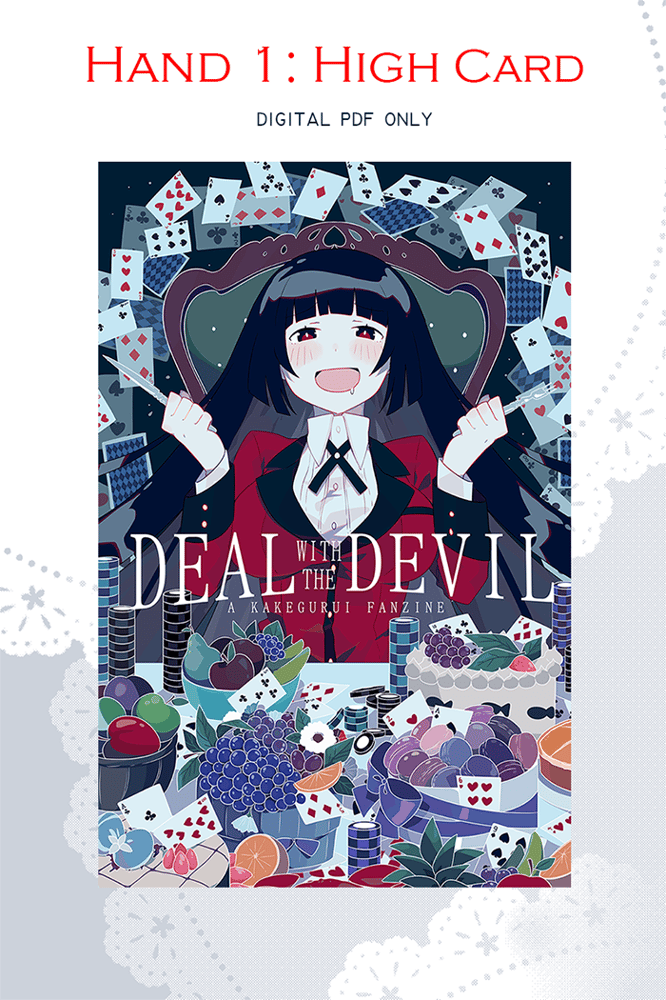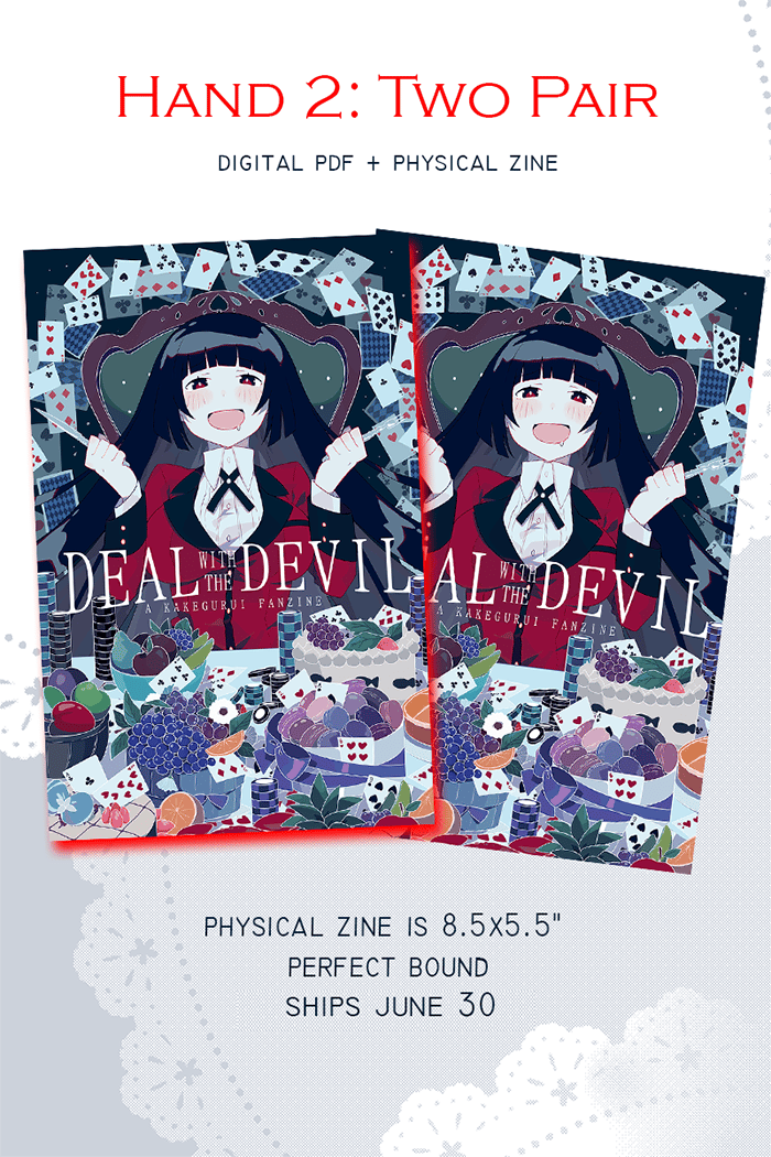 Includes BOTH digital PDF and physical copy of Deal with the Devil: A Kakegurui Fanzine ♤ The physical zine 8.5"x5.5", perfect bound.